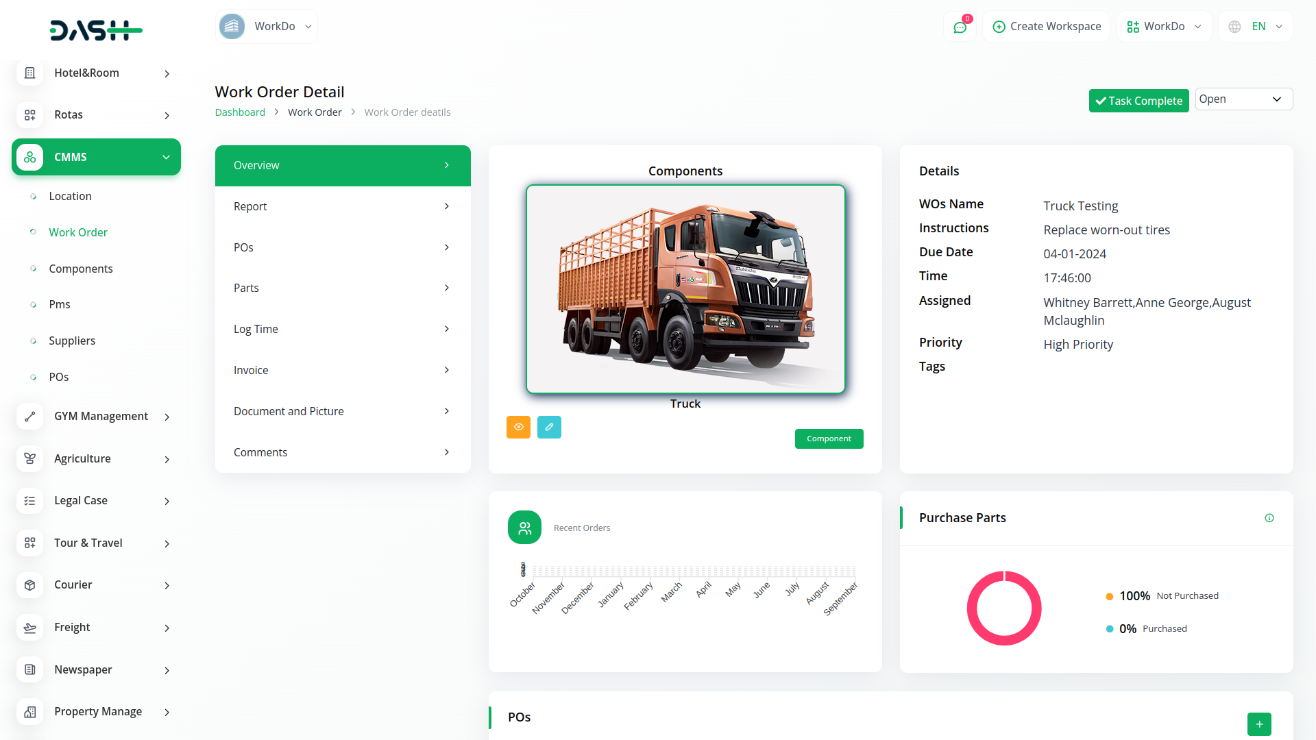 CMMS gives users deep insight into their maintenance needs with detailed work order schedules, reliable reports, dashboards, log times.