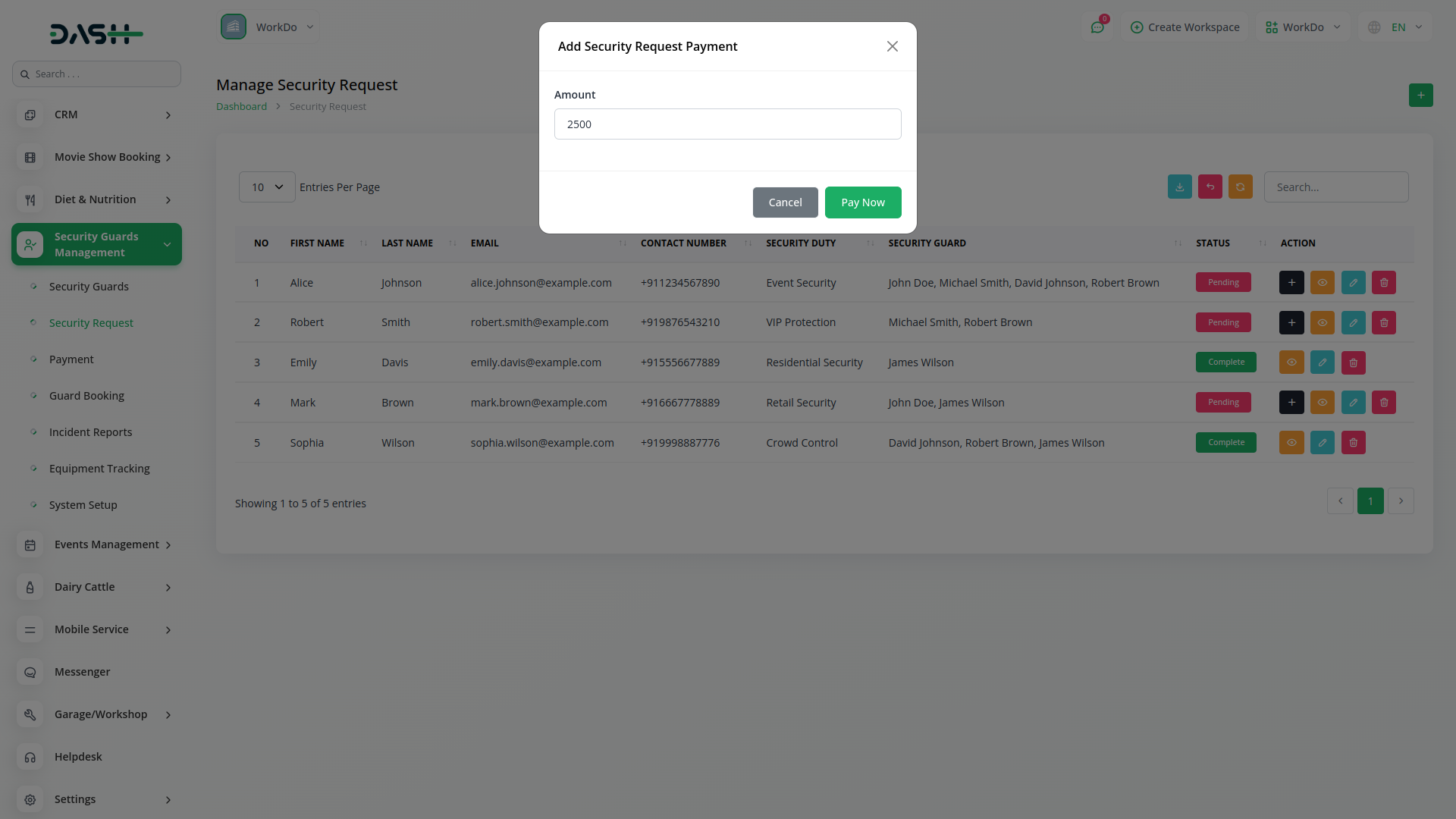 Manage and track payments efficiently for security services requested. The system allows you to monitor paid and pending amounts related to security requests, ensuring smooth financial operations without the need for complex invoicing or billing processes.
