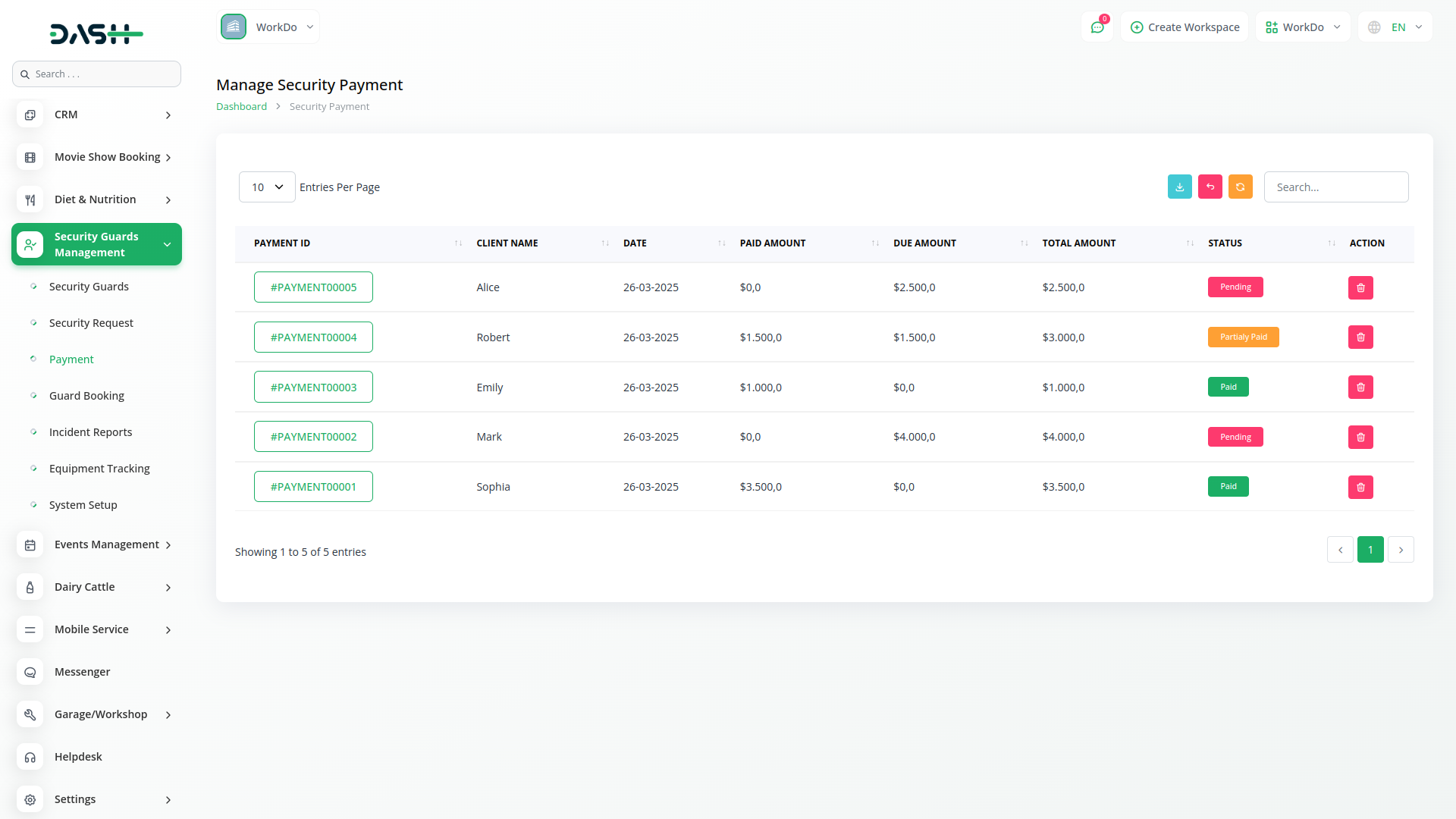 Manage and track payments efficiently for security services requested. The system allows you to monitor paid and pending amounts related to security requests, ensuring smooth financial operations without the need for complex invoicing or billing processes.